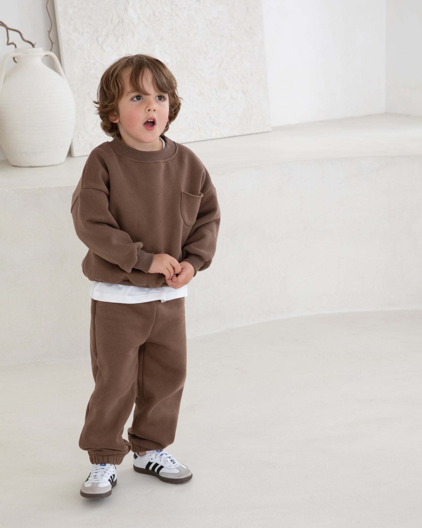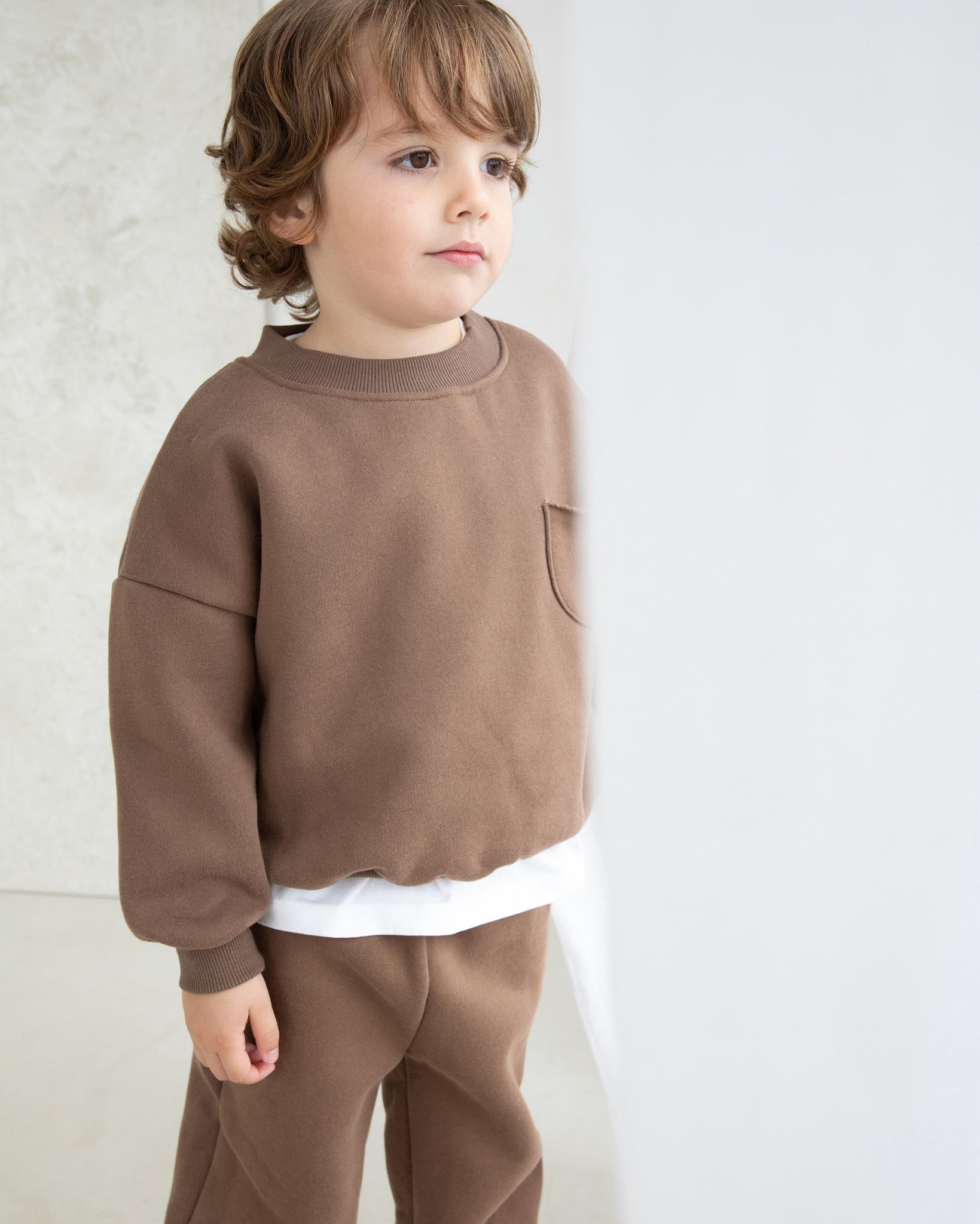 Our Super soft sets consist of A stylish boxy sweater with raw hem pocket and ribbed trim whilst our matching joggers are designed with an elasticated waist and cuffs for the perfect fit. We love how our sets can be worn together or as separates. Lined with a soft fleecy lining this two-piece is perfect for any little minimalist.